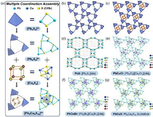 在前期研究中,该研究团队已发展出一种基于配位驱动组装的普适性方法,用于构筑水稳定的卤化铅框架。通过引入Pb2+–羧酸配位基元,材料在水相中仍能保持结构稳定,为其在水相光催化奠定了基础。基于此,研究团队进一步聚焦于双金属活性位点在CO2光还原过程中对电荷极化反应中心的关键作用,通过双重配位组装策略,使[Cu4X4]簇通过Cu–X–Pb键合有序嵌入三维卤化铅骨架中,构筑了具有 Cu–X–Pb键合网络的三维Cuᴵ/Pbᴵᴵ卤化物框架。
