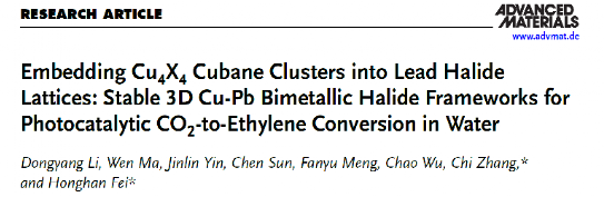 标题:Embedding Cu4X4 Cubane Clusters into Lead Halide Lattices: Stable 3D Cu-Pb Bimetallic Halide Frameworks for Photocatalytic CO2-to-Ethylene Conversion in Water
