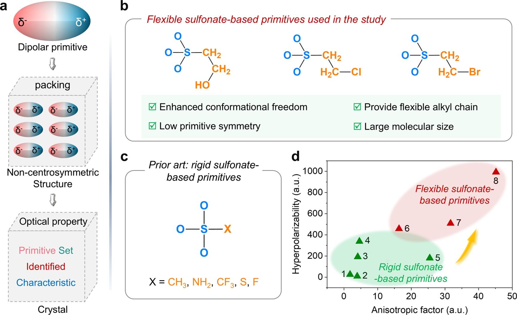 在这一研究中,针对传统有机磺酸盐晶体难以兼顾宽禁带与强二阶谐波响应的挑战,研究团队创新性地采用柔性磺酸根基元 [SO3(CH2)2X]- (X = OH, Cl, Br)作为构建单元,并通过两种路径实现结构与性能的精准优化:一是替换抗衡阳离子(Li+, Na+),以改变晶体配位环境与分子堆积方式;二是修饰阴离子烷基尾端取代基,从而调控分子间氢键作用与偶极矩排列。基于上述设计策略,研究团队成功制备了一系列新材料:母体化合物Li[SO3(CH2)2X] (X = Cl, Br), 极性化合物Na[SO3(CH2)2X] (X = Cl, Br),以及性能最优的Li [SO3(CH2)2OH]。研究发现,在Li [SO3(CH2)2OH]晶体中,[SO3(CH2)2OH]-阴离子通过氢键与离子键的协同作用形成平行排列,有效避免了偶极矩的相互抵消;而对比晶体Li[SO3(CH2)2X]和Na[SO3(CH2)2X]则分别呈现反平行和交错反平行排列。这种由连接性调控主导的结构差异,直接导致了晶体宏观光学性能的显著分化。