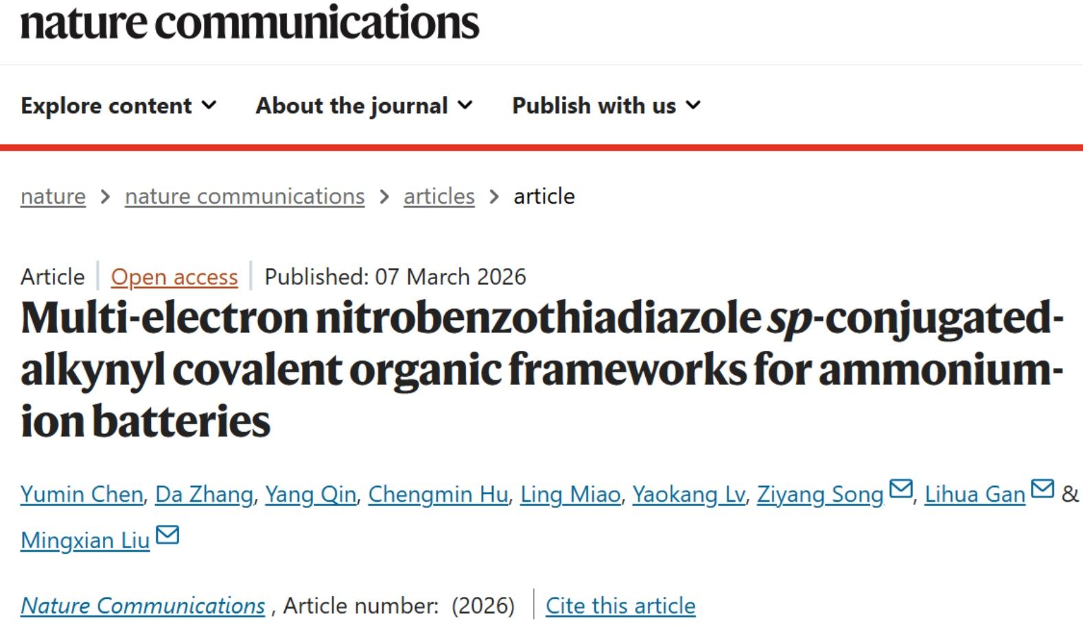 公司甘礼华教授、刘明贤教授团队长期致力于高效储能材料研究并应用于新能源电池,课题组近期设计了多电子硝基苯并噻二唑共价有机框架,促进快速稳定的NH4+氢键配位,揭示了硝基/噻唑双活性中心多电子氧化还原电荷存储机制,有效解决了单电子储能容量低和结构不稳定的问题,构建了高能量密度和超长循环寿命的铵离子电池。相关研究成果以Multi-electron nitrobenzothiadiazole sp-conjugated-alkynyl covalent organic frameworks for ammonium-ion batteries为题,近日在线发表于《自然·通讯》(Nature Communications)。