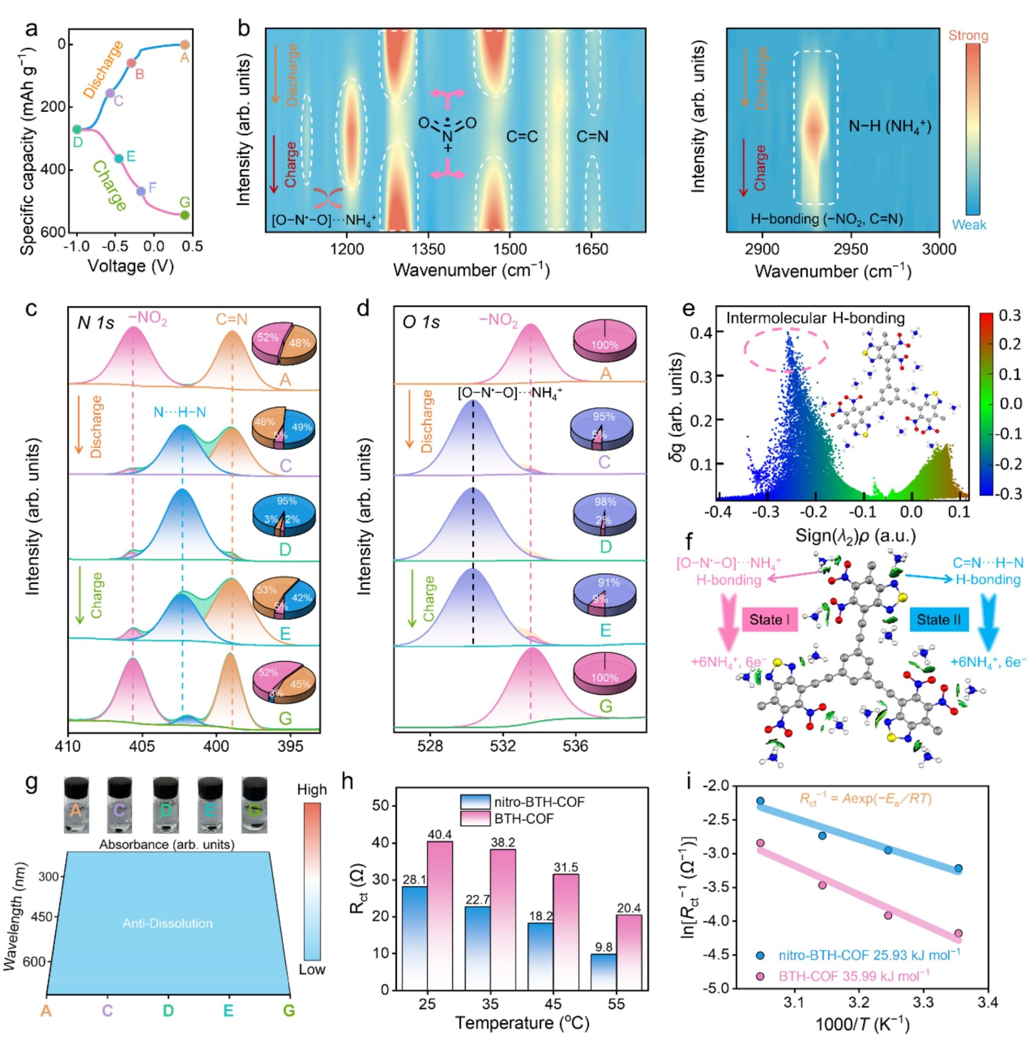 通过引入强吸电子的硝基苯并噻二唑活性单元与高导电性的炔键桥联结构,形成硝基苯并噻二唑共价有机框架(nitro-BTH-COF),高密度硝基/噻唑活性位点和高度离域π-共轭体系,确保了多重双电子硝基/噻唑位点具有高NH4+可及性(利用率达95.2%)和低活化能(25.93 kJ mol−1)。