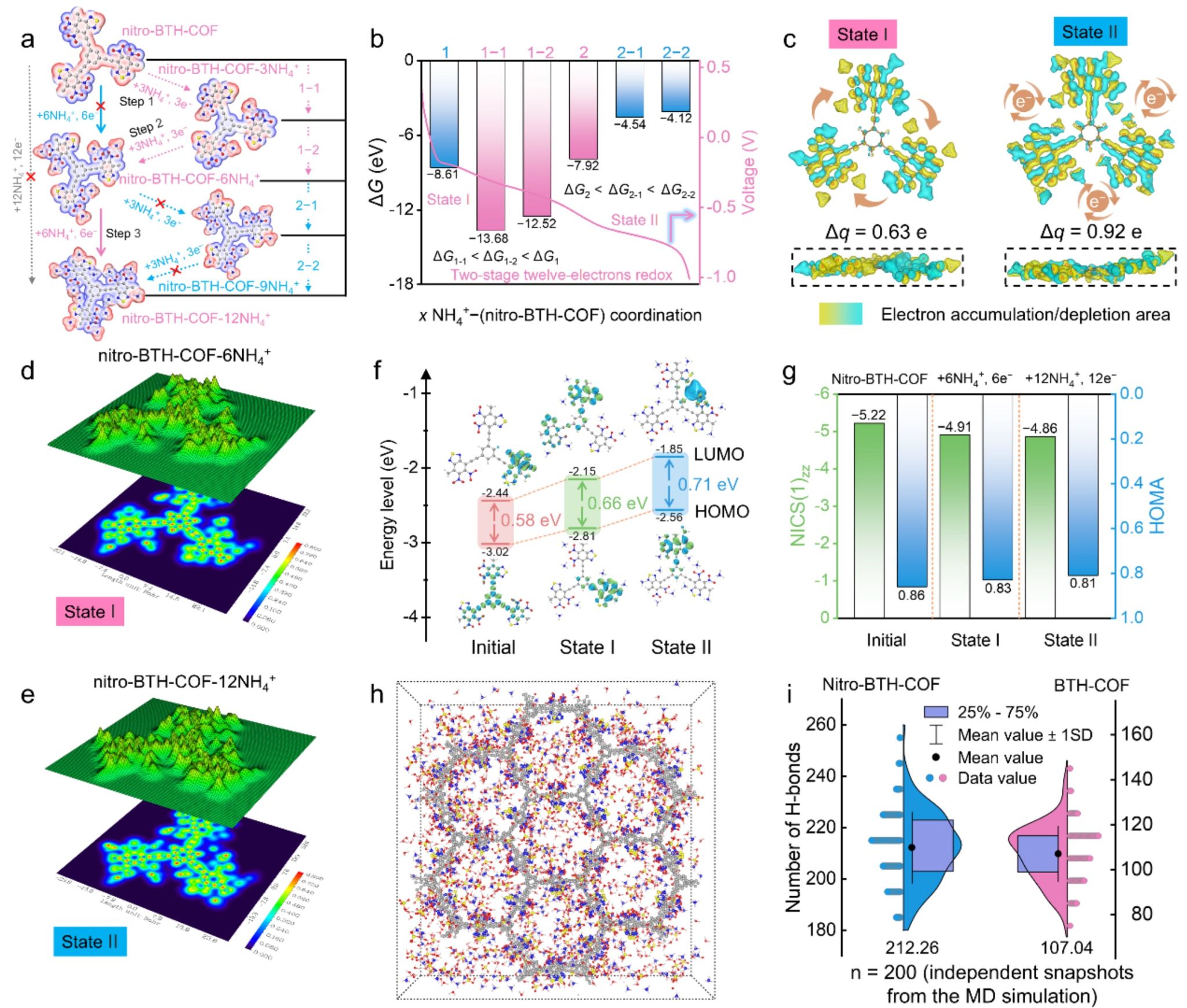 密度泛函理论计算证实了“先硝基、后噻唑”的两步12 e−氧化还原反应机制。分子动力学模拟进一步证实,硝基/噻唑基团与NH4+在界面形成了高密度氢键网络,促进nitro-BTH-COF负极稳定的电荷存储。