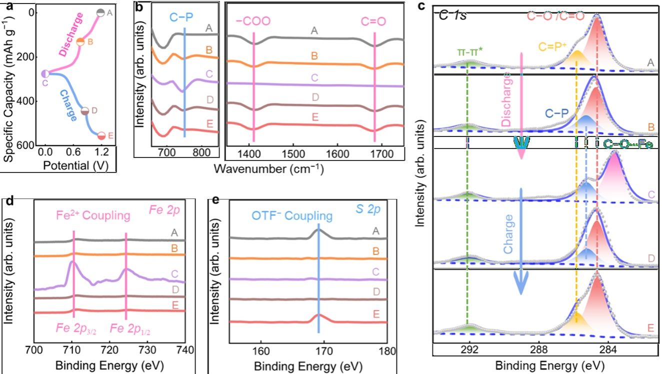 异位光谱研究表明,PTBA的羧基/磷位点展示出高电化学活性,促进羧基位点与Fe2⁺稳定配位,并赋予CF₃SO₃⁻高效利用P活性中心,引发高度可逆的氧化还原反应。