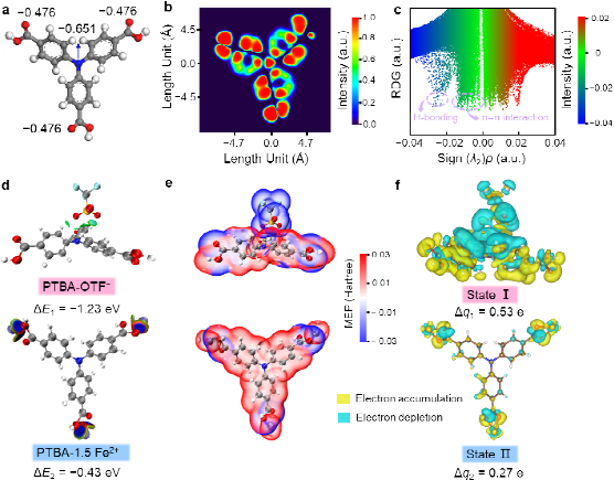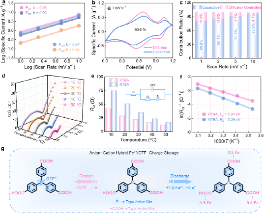 分子动力学模拟和理论计算揭示低能垒电荷存储机制,PTBA中P元素的低电负性和低能量壁垒(N>P),强化了 Fe2+与羧基的配位作用,并促进 CF3SO3−与磷中心的近距离相互作用,使活化能低至0.24 eV(低于NTBA的0.29 eV),显著提升了反应动力学。