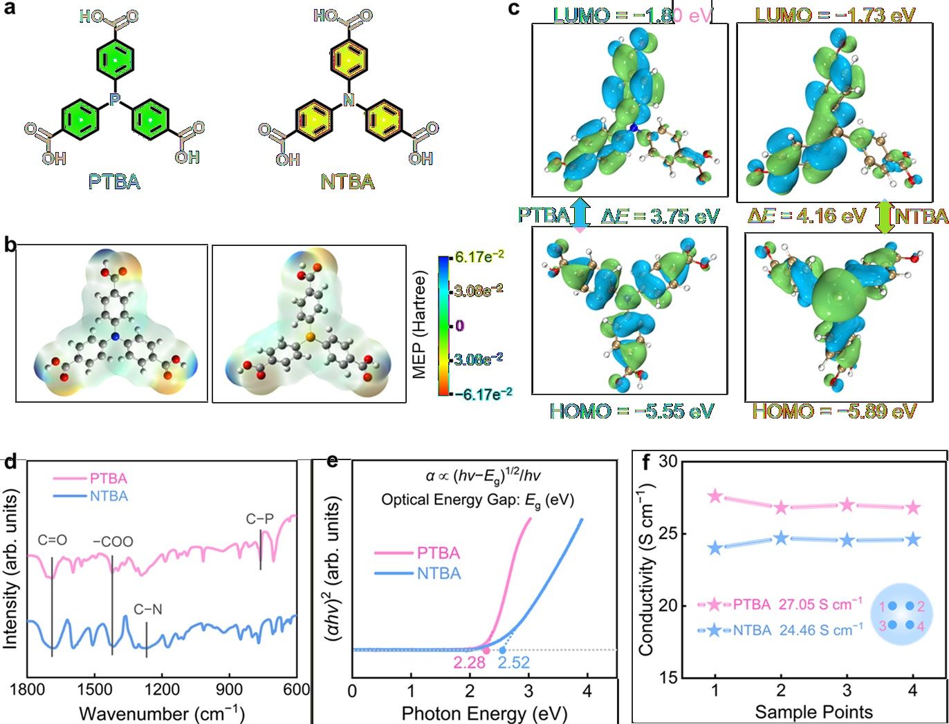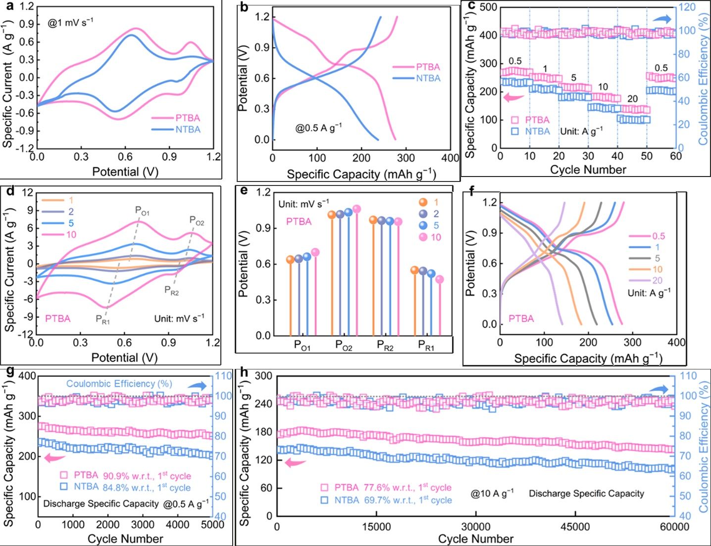 实验表征和理论计算表明,得益于更低的电负性和能垒(N > P),PTBA展示出低能带间隙、高导电性和亲电活性,有助于提高电子转移动力学和电极氧化还原速率。