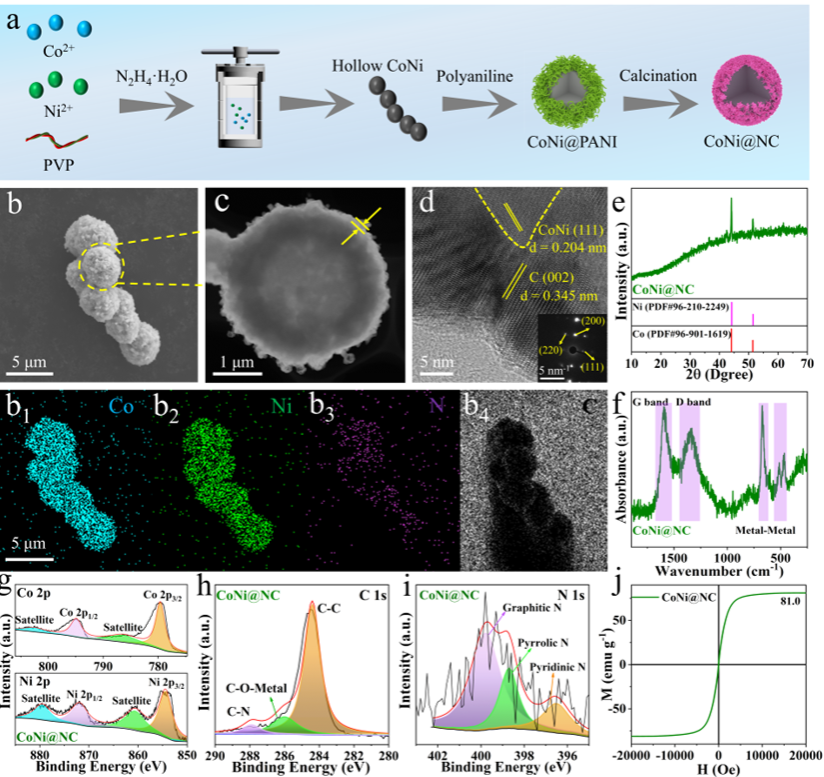 Figure 1. (a) Schematic illustration for fabrication of CoNi@NC. (b) SEM image and EDS elements mapping of CoNi@NC (b1) Co, (b2) Ni, (b3) N and (b4) C elements. (c) TEM image of CoNi@NC. (d) Lattice fringe images and inset shows SAED image of CoNi@NC. (e) XRD spectra of CoNi@NC. (f) Raman spectra of CoNi@NC. (g) Co 2p spectra and Ni 2p spectra, (h) C 1s spectra, (i) N 1s spectra for CoNi@NC. (j) M-H curve of CoNi@NC.