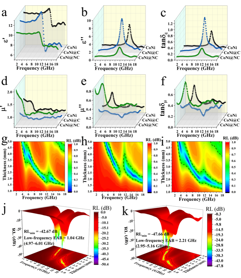 Figure 2. (a) ε′ of permittivity, (b) ε′′ of permittivity, (c) dielectric loss, (d) μ′ of permeability, (e) μ′′ of permeability, (f) magnetic loss for CoNi, CoNi@C, and CoNi@NC. (g–i) 2D color diagrams of impedance matching for CoNi, CoNi@C, and CoNi@NC. (j, k) 3D color diagrams of reflection loss for CoNi@C and CoNi@NC.