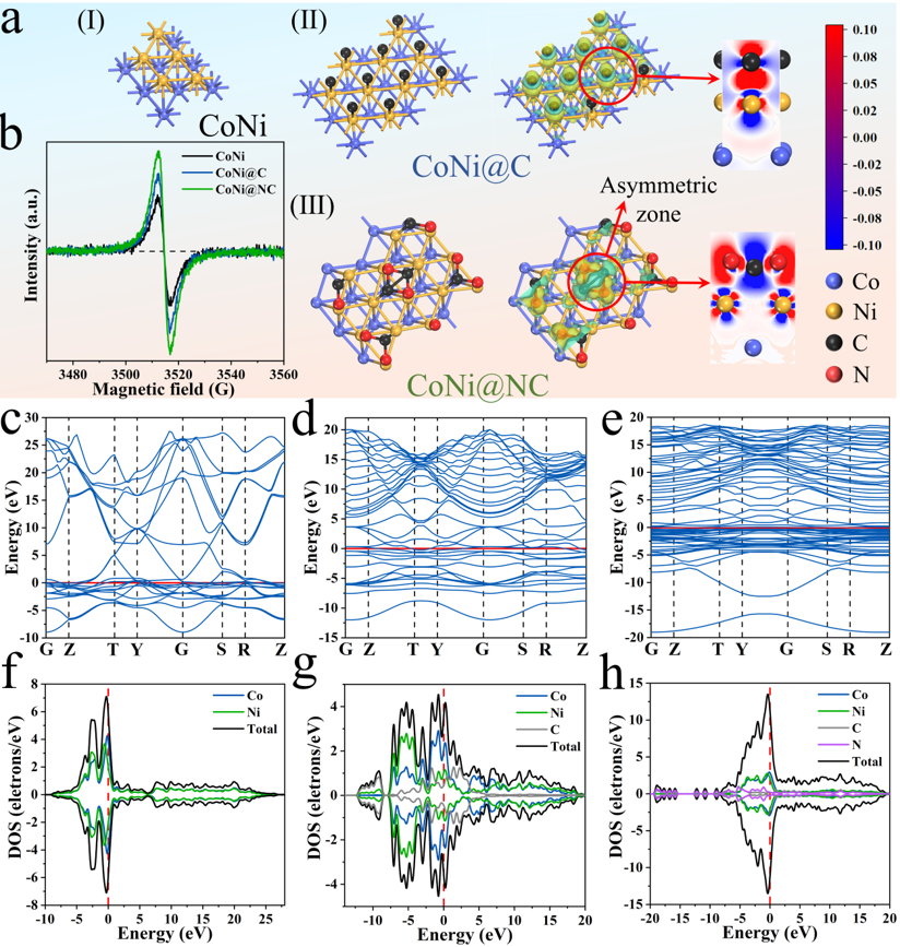 Figure 5. (a) 3D Differential charge distributions and 2D cut-away distributions of CoNi, CoNi@C, and CoNi@NC. (b) EPR spectra of CoNi, CoNi@C, and CoNi@NC. (c–e) Energy band structures of CoNi, CoNi@C, and CoNi@NC. (f–h) DOS of CoNi, CoNi@C, and CoNi@NC.