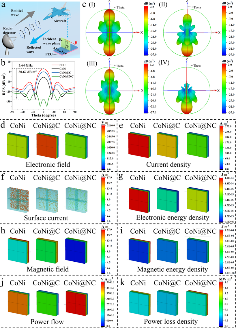 Figure 4. (a) Working principle of radar detectors. (b) RCS simulation curves of PEC, CoNi, CoNi@C, and CoNi@NC within the detection range of −90° ≤ θ ≤ 90°. (c) CST far-field simulation results of (I) PEC, (II) CoNi, (III) CoNi@C, and (IV) CoNi@NC. (d–k) Finite element simulations of CoNi, CoNi@C, and CoNi@NC.