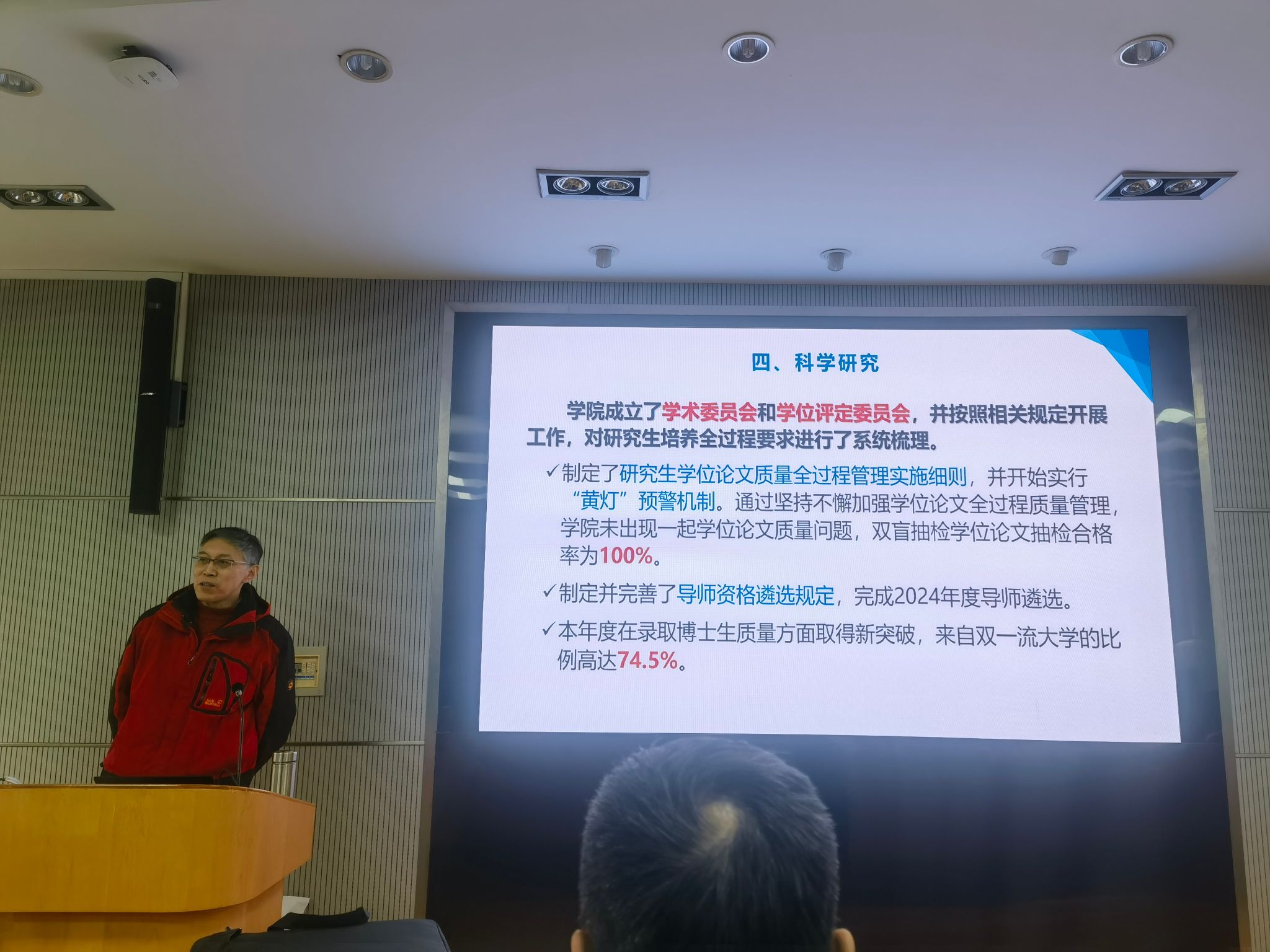 当天,2024年第一次全院教职工大会举行,张弛向全院教师介绍了2023年工作情况和奖励性绩效发放方案、岗位聘任与薪酬改革总体思路与情况。党委书记曹同成支持会议,在全院大会上领学了1-2月教职工政治理论学习内容,并就教职工理论学习自学进行了部署。
