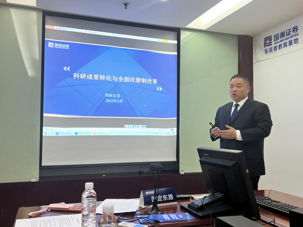 国海证券的党员代表、上海国定东路营业部财富中心的高级投资顾问杨森龙以“科研成果转化与全面注册制”为题,向大家介绍了全面注册制改革后对于科研型、创新型企业IPO上市的影响和意义,探讨交流了全面注册制政策指导下资本市场如何助力科研成果转化。教工第二党支部教师代表史慧杰结合自己的研究课题向大家介绍了生物质分子高选择性催化转化的应用前景,并对《“十四五”可再生能源发展规划》中提出的稳步推进生物质能多元化开发进行了解读。