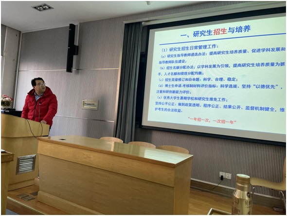 副经理刘明贤从研究生招生与培养、科研工作、实验室安全三个方面总结汇报了自2017年11月任现职以来的主要工作,以及学院在科学研究方面所取得的重要成果。2016年至今,学院师生在五个“化学+”交叉领域发表高水平论文1127篇,其中包括在化学、材料顶级期刊发表的51篇具有国际影响力的成果。学院教师主持的国家级科研项目累计达73项,其中重点项目3项、国家杰青1项、国家优青3项,获批国家重点研发计划子课题7项,科研经费到款数10307.38万元。学院成立以后还实现了省部级科研奖项的突破。
