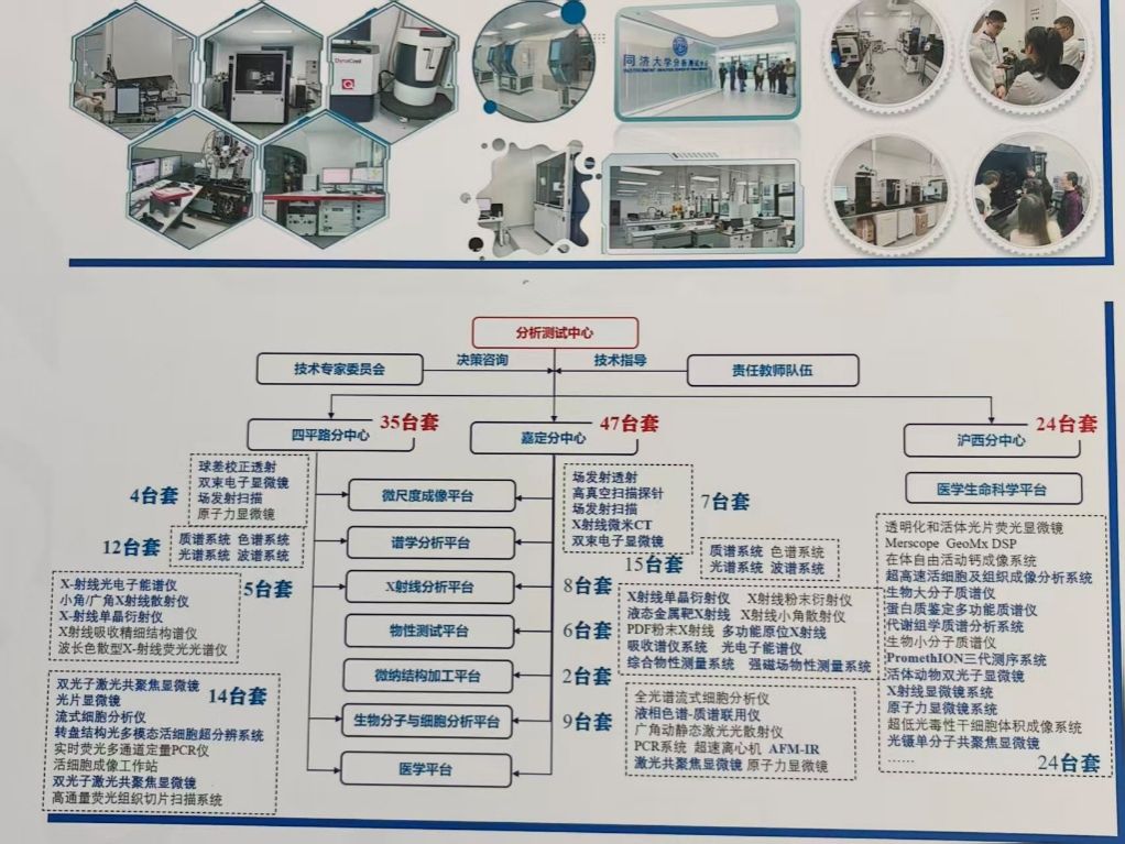 本次展览位于四平路校区衷和楼一楼大厅,分“分测中心建设概览”“核心装备集群”“重大基础设施”“全国重点实验室配套”“学院级共享网络”五大板块,分测中心图文与实物模型并举,集中展示了2021—2025年间学校新增106台套、总值5.77亿元的大型科研仪器。展板数据显示,学校已形成“一中心、三校区、七平台”的整体架构——分析测试中心统筹管理,四平路、嘉定、沪西三分中心错位布局,微尺度成像、谱学分析、X射线分析、物性测试、微纳结构加工、生物分子与细胞分析、医员工命科学七大平台协同发展,建成面积4506平方米,未来拓展至5455平方米。技术专家委员会、责任教师队伍、决策咨询委员会三层治理体系同步运行,保障仪器“建设—运行—共享—评价”全周期规范有序。