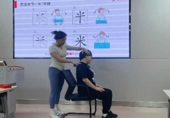 在现场体态检测环节,岳老师现场示范颈椎灵活度、胸椎灵活性、肩膀灵活度和肩胛带等能力的测试,老师们2人一组,纷纷进行了互测,记录自己的体态问题。