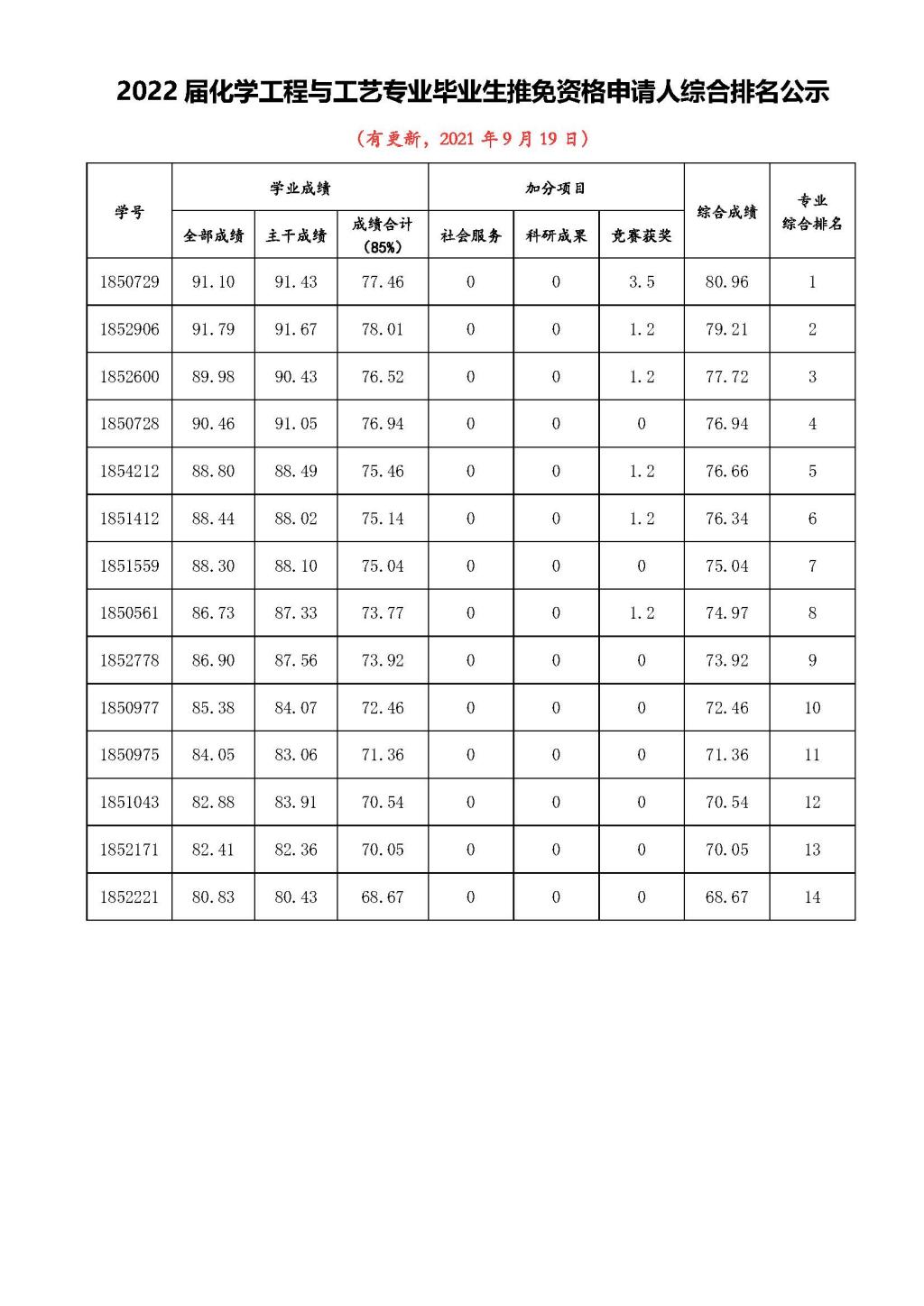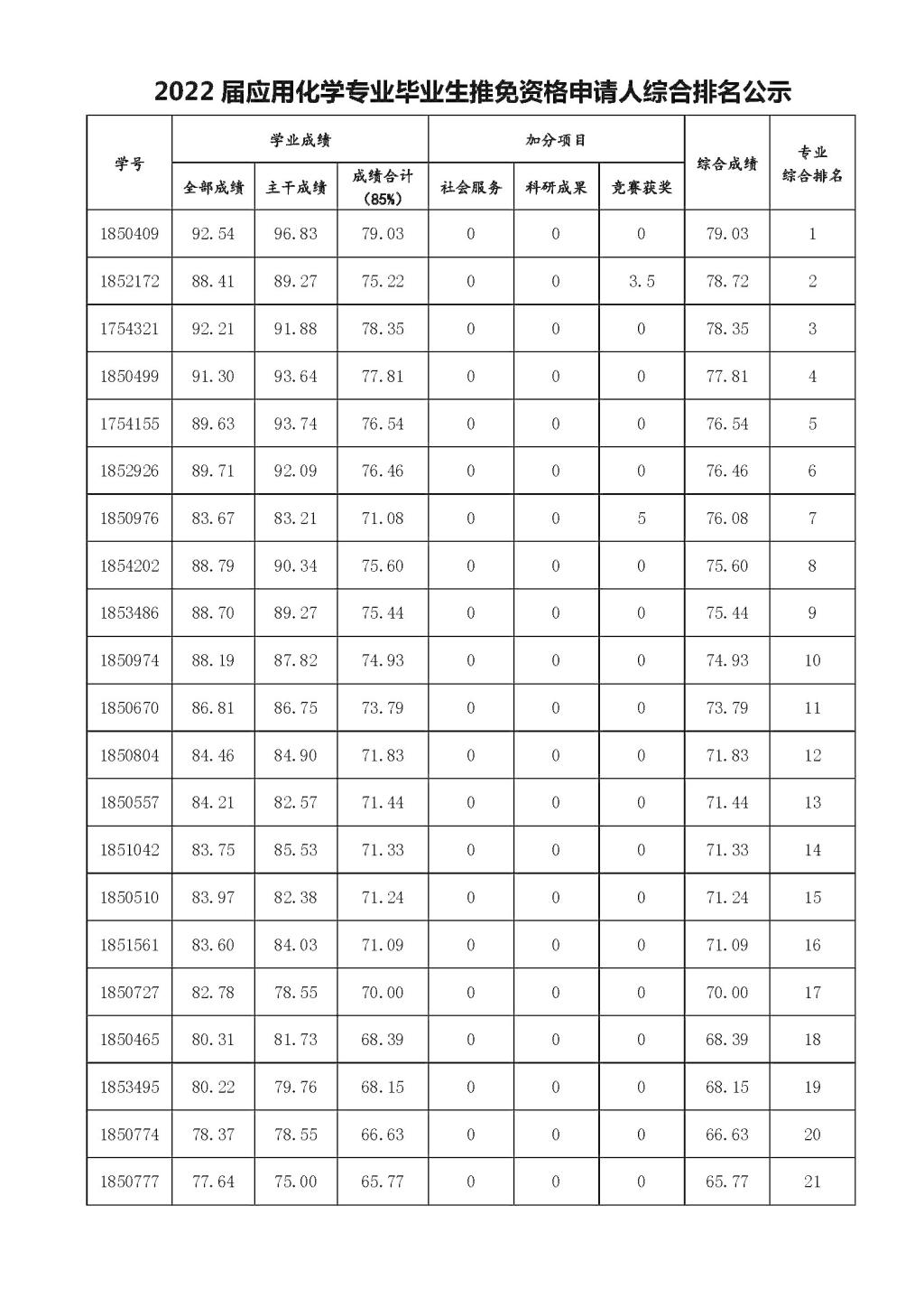 附件1:应用化学专业推免资格申请人综合排名公示