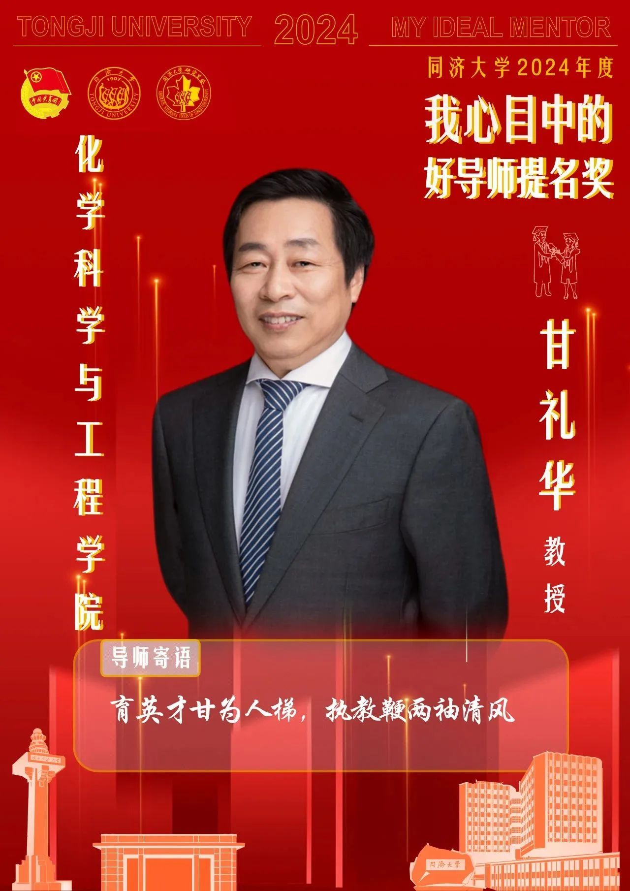 为深入学习贯彻习近平新时代中国特色社会主义思想,贯彻落实教育部《关于全面落实研究生导师立德树人职责的意见》的文件精神,大力弘扬教育家精神;为推进导生关系交汇融通,弘扬严谨求实、开拓创新的科研态度;为集中展现公司研究生导师诲人不倦、爱岗敬业的良好风尚与崇高使命,传承自强不息、严谨治学的同济精神。在best365中国官方网站研究生院、best365中国官方网站党委教师工作部、best365中国官方网站党委研究生工作部、共青团best365中国官方网站委员会的指导下,best365中国官方网站研究生会在全校范围开展了best365中国官方网站2024年度“我心目中的好导师”系列活动。经过课题组申报、学院推荐、学校决赛,甘礼华教授获得“我心目中的好导师”提名奖。