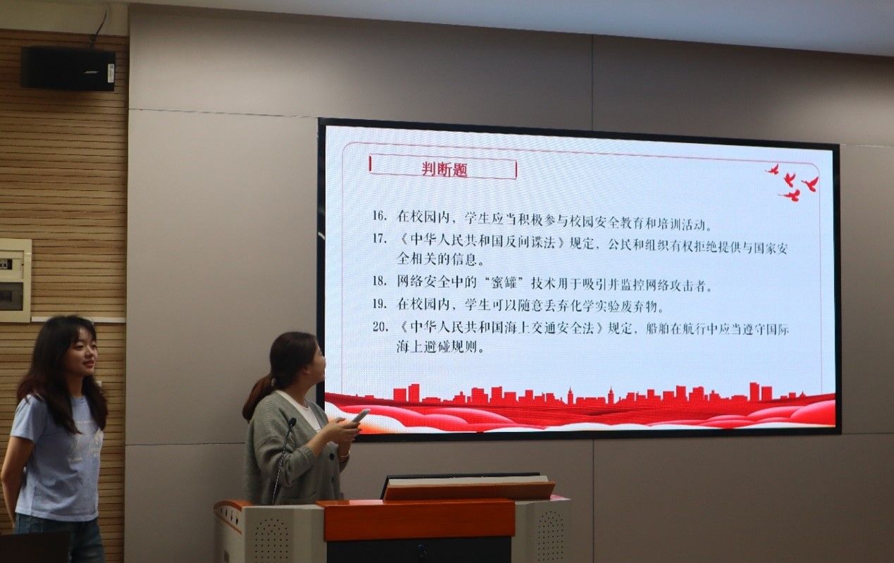 母朝静指出,全民国家安全教育日是为了增强全民国家安全意识,维护国家安全而设立的节日。他向在座的师生介绍了全民国家安全教育日设立的背景和现实意义,回顾了总体国家安全重点领域随着形势发展的变化,已经拓展到包括政治安全、国土安全、金融安全、粮食安全、人工智能安全、数据安全等20个领域,与我们每个人日常生活的方方面面都息息相关。他希望大家通过此次活动进一步加深对国家安全重要性的理解,筑牢“维护国家安全没有‘局外人’,每个人都是国家安全的守护者”意识。本次主题党日知识竞赛题目涵盖了国家安全尤其是网络、校园、实验室安全等与同学们生活密切相关的各方面知识,以抢答的方式进行。知识竞赛结束后,大家还一起观看了《千万高校员工同上一堂国家安全教育课》。