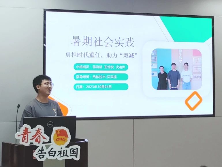 在“勇担时代重任”专题,来自化学院的蒋海斌同学分享其团队开展的社会实践项目。该团队项目聚焦教育领域中的“双减”政策,以南浔实验小学为实践地点,开展不同学科的趣味课程,关注员工的课余生活,为他们送关怀、办实事。在促进员工全面发展、健康成长等方面贡献了自己的一份力量。该项目于去年暑假开展,是去年优秀项目代表。