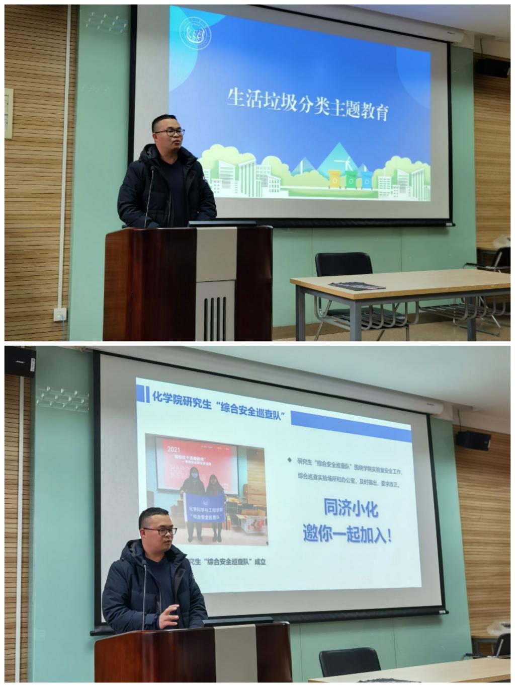 公司党委副书记母朝静对于到场的师生开展了生活垃圾分类教育,介绍了学院上学期在“劳动教育”实践环节组织的志愿者活动及寒假期间成立的研究生“综合安全巡查队”。母老师鼓励班级骨干积极在班级建设中担任好管理者与引领者的角色,做好普通同学和学院之间的桥梁,带领班级同学继续保持垃圾分类的好习惯,并动员他们参与到学院的“综合安全巡查队”志愿者活动中。