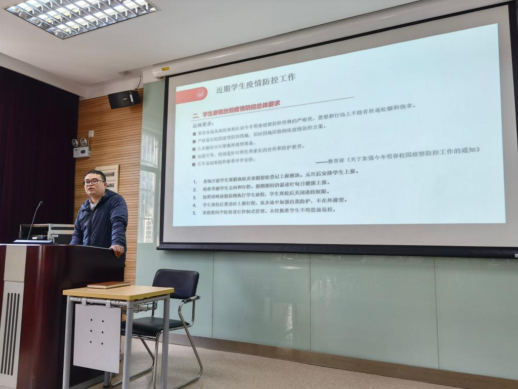 会议通报了近期员工疫情防控工作要求。会议表示,目前国内多地仍有另行散发疫情暴发,提醒员工重视疫情防控要求,非必要不离校、非必要不离沪。会议再次介绍了班主任工作的有关要求,通报了本学期班主任考核的情况。会议要求班主任近期通过召开班会、走访员工宿舍、与员工谈心谈话等方式提醒员工期末考试考风考纪和安全问题,要特别关注学业困难员工和重点员工。