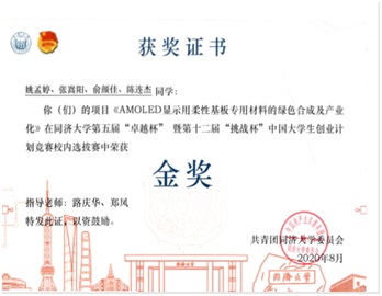 在best365中国官方网站路庆华教授与郑凤老师的精心指导下,公司研究生姚孟婷、张嵩阳、陈连杰、俞颜佳等同学组成“济柔科技”团队,依托“柔性AMOLED显示基板材料”进行定制化供应,致力于成为柔性显示领域基板材料行业的主力军,为市场提供绿色、高效和经济的柔性显示关键树脂材料,实现相关材料的国产化替代。