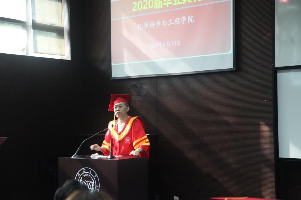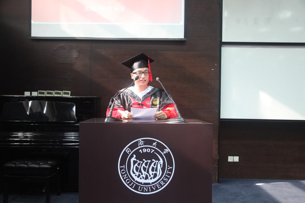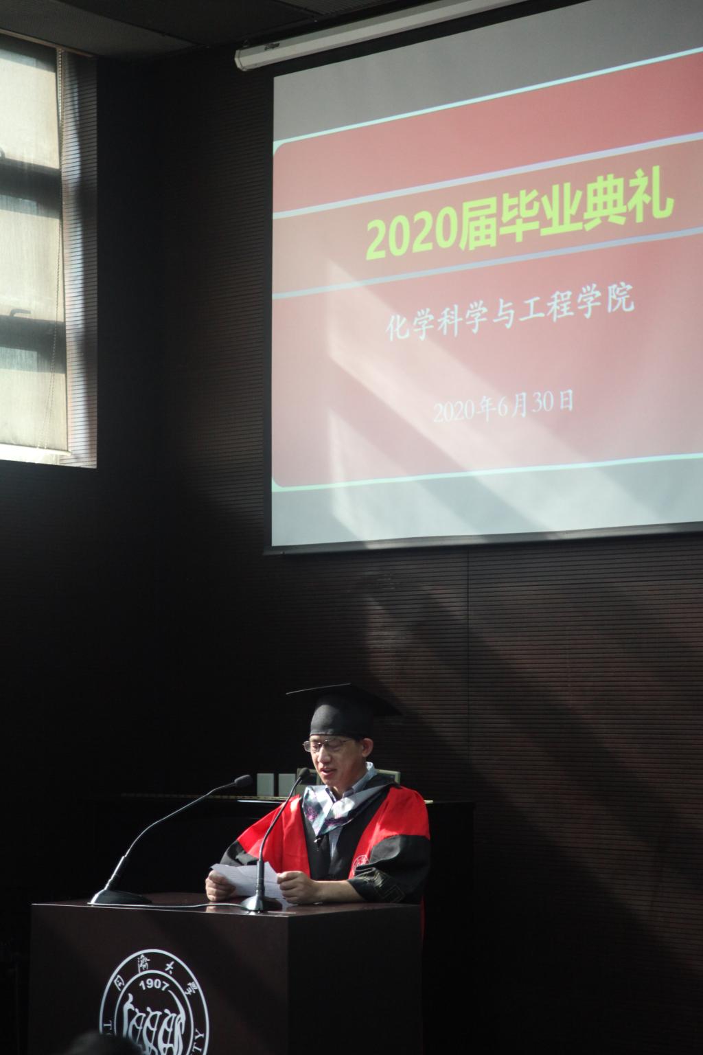 魏俊杰同学代表全体毕业研究生发言。他分享了自己在同济、在同济化学学习生活九年的所思所想。他说,感谢母校和学院的培养,为我的学习成长搭建起追求卓越的阶梯;感谢所有学院老师在学业和生活上的关心与帮助,使我原本荆棘丛生的道路变得光明而平坦;感谢所有同学与好友的陪伴与鼓励,让我有勇气能自信地面对各种困难与挑战;还要特别感谢化学这一学科,是它教会了我知行合一、上下求索的科学真谛。
