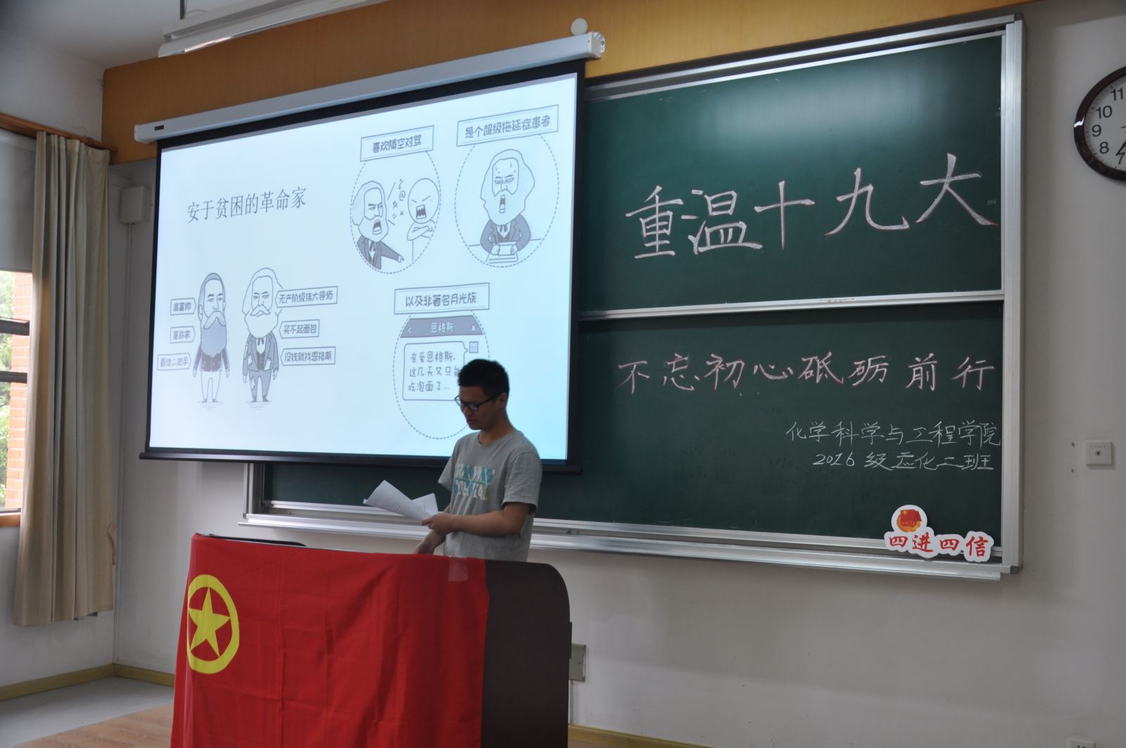 其次是万佳成同学带来了红歌演唱:《我的祖国》和《不忘初心》,更向所有人阐明了红歌背后的故事和红歌的意义,号召支部同学们多听红色歌曲,也让所有支部成员感受到红歌对于人心灵的洗涤。杨正新同学通过漫画、趣闻和学术相交讲述了马克思的一生,显得整个报告活泼有趣。通过生动有趣的展示,大家对从新的角度看到了与书本上不一样的马克思,对伟人的理想与追求有了更进一步的认识。