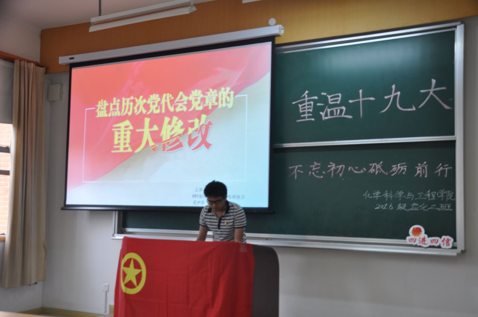 接着支部成员开始分享自己的学习体会。首先是饶文龙的讨论小组关于党章的修改为了我们做了简要的报告,从侧面从党章的不断修改与完善中反映了党的成长与成熟,让支部成员对于党的了解更加的深刻,而党章也显得没有那么的刻板,而是带有其独特的历史。
