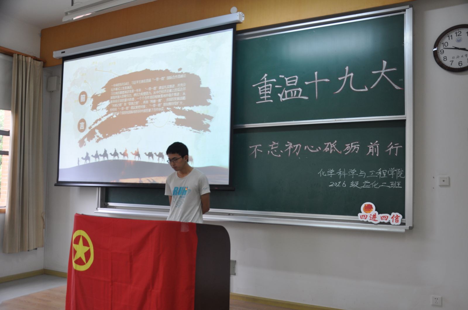 接着,田凤超、瞿祥昌同学详细通过充分的准备,为支部同学详细讲解了关于一带一路的建设,从背景,意义以及建设成果三方面着手,让支部成员了解到一带一路不仅仅是国家的事,也是每个人都应该了解到的惠及世界很多地方的大的发展历程。然后以一首动听的歌曲——《我的中国心》结尾,现场的气氛被推向高潮。活动最后,团支书和特邀嘉宾韦广丰老师也先后做了简单的总结。韦广丰老师鼓励支部成员要不忘记自己的初心,在学习上生活上都要做到!