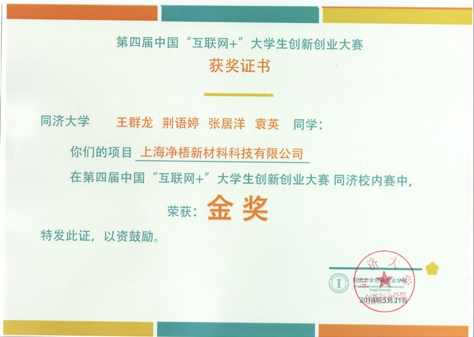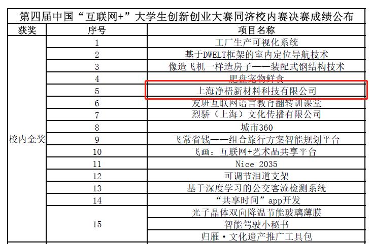 在日前结束的第四届中国“互联网+”老员工创新创业大赛best365中国官方网站校内决赛上,公司推荐的王群龙团队的项目《上海净梧新材料科技有限公司》 获得校内金奖,并被推荐将参加6月上旬举行的中国“互联网+”老员工创新创业大赛上海市复赛。