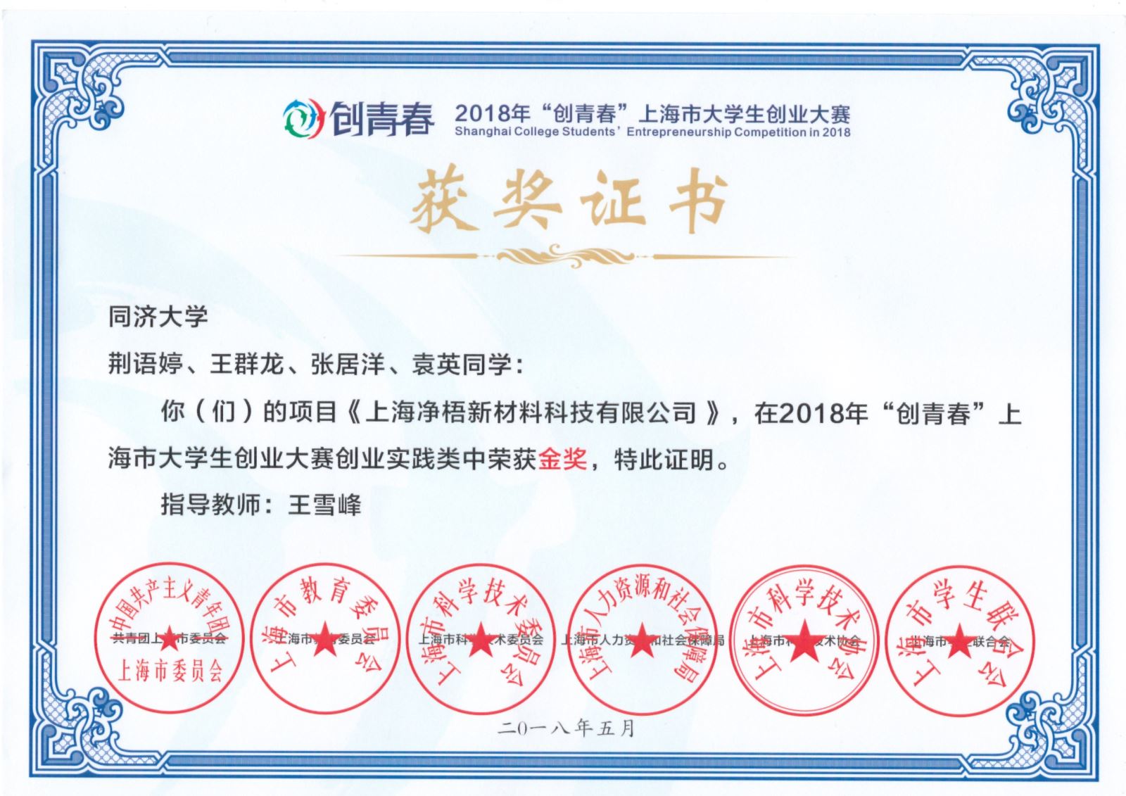 在王雪峰教授指导下,由公司毕业生和在校生荆语婷、王群龙、张居洋、袁英等四位同学申报的项目《上海净梧新材料科技有限公司》荣获此次大赛创业实践类金奖。