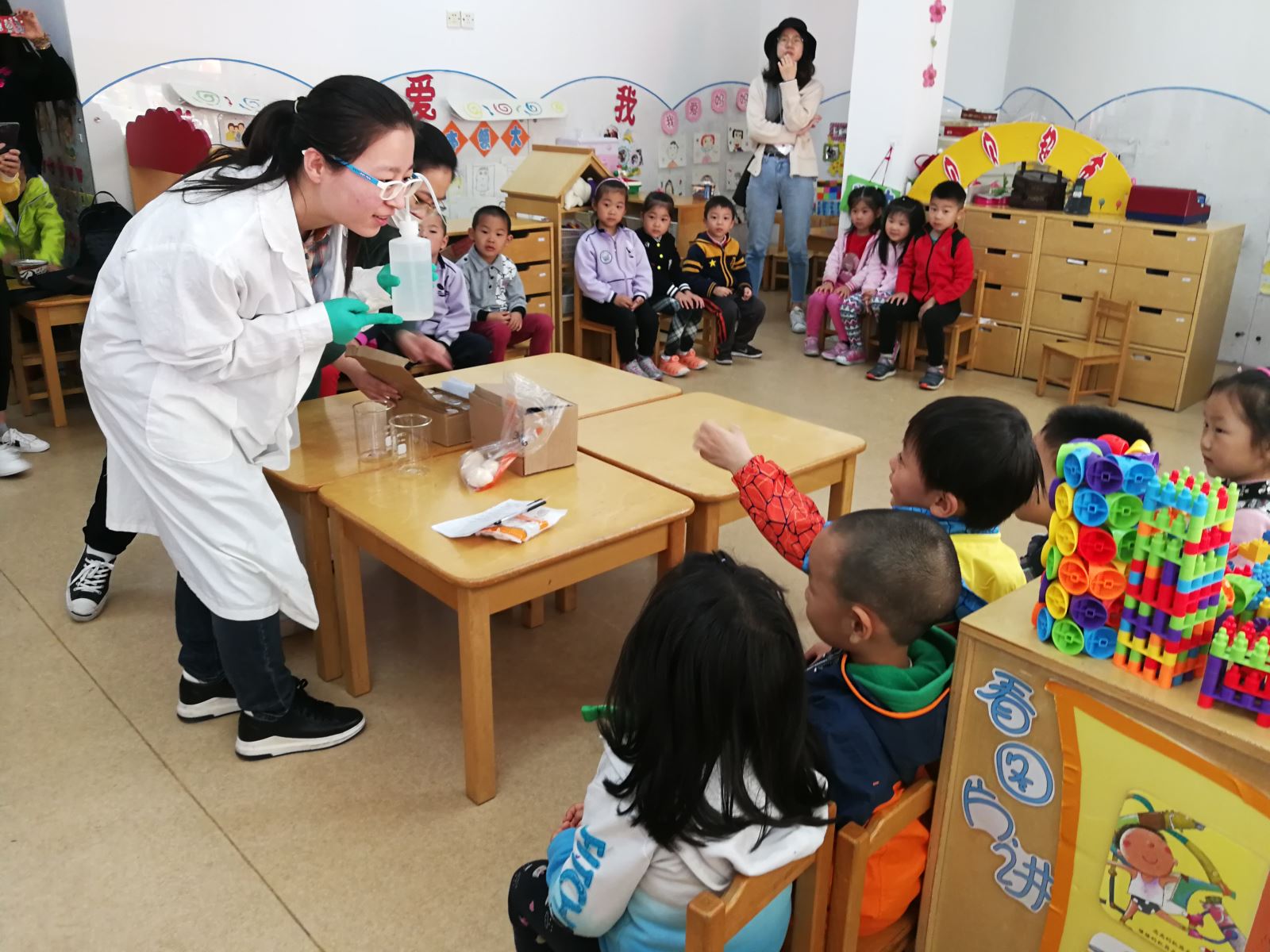 最后,为孩子们展示了经典又简单的变色实验,利用酚酞遇碱变红的原理,给孩子们展示了精彩的变色实验,过程中穿插着一些问题,对孩子们进行了简单的提问,意欲启发孩子们,因为对比明显的颜色变化,孩子们踊跃作答,天马行空的答案给室内带来一片欢声笑语,气氛很是轻松。