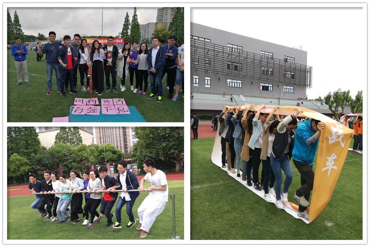 开幕式后,公司学子参加了同心笔、无敌战车、旋风跑、50米迎面接力、跳绳比赛等趣味项目比赛。在“同心笔”游戏中,每人牵拉一根笔上的绳子,团队成员完成书写“同舟共济,自强不息”八个字。在“无敌战车”游戏中,利用专用的帆布履带,团队站在履带当中协作完成前进20米,化学院的同学们以小组第二名的好成绩获得了游戏的胜利。在“旋风跑”游戏中,随着裁判员的一声令下,蓄势待发的公司参赛队员如离弦之箭般冲出,脸上洋溢着笑容,有条不紊地绕道第一个旋转点。到达旋转点后,靠近旋转点远处的同学们整齐有序地往内减速,而后轻松绕过第一道关卡。整个比赛过程干净利落,步伐流畅自然,行云流水。“旋风跑”项目的难点在转弯处,离心力的作用使得外围同学不能过分减速,要求内侧的同学熟练地调整自身速率,由外至内保持速率递减的趋势。这些趣味竞赛增强了同学们团结协作的能力,也展示了公司学子的精气神。