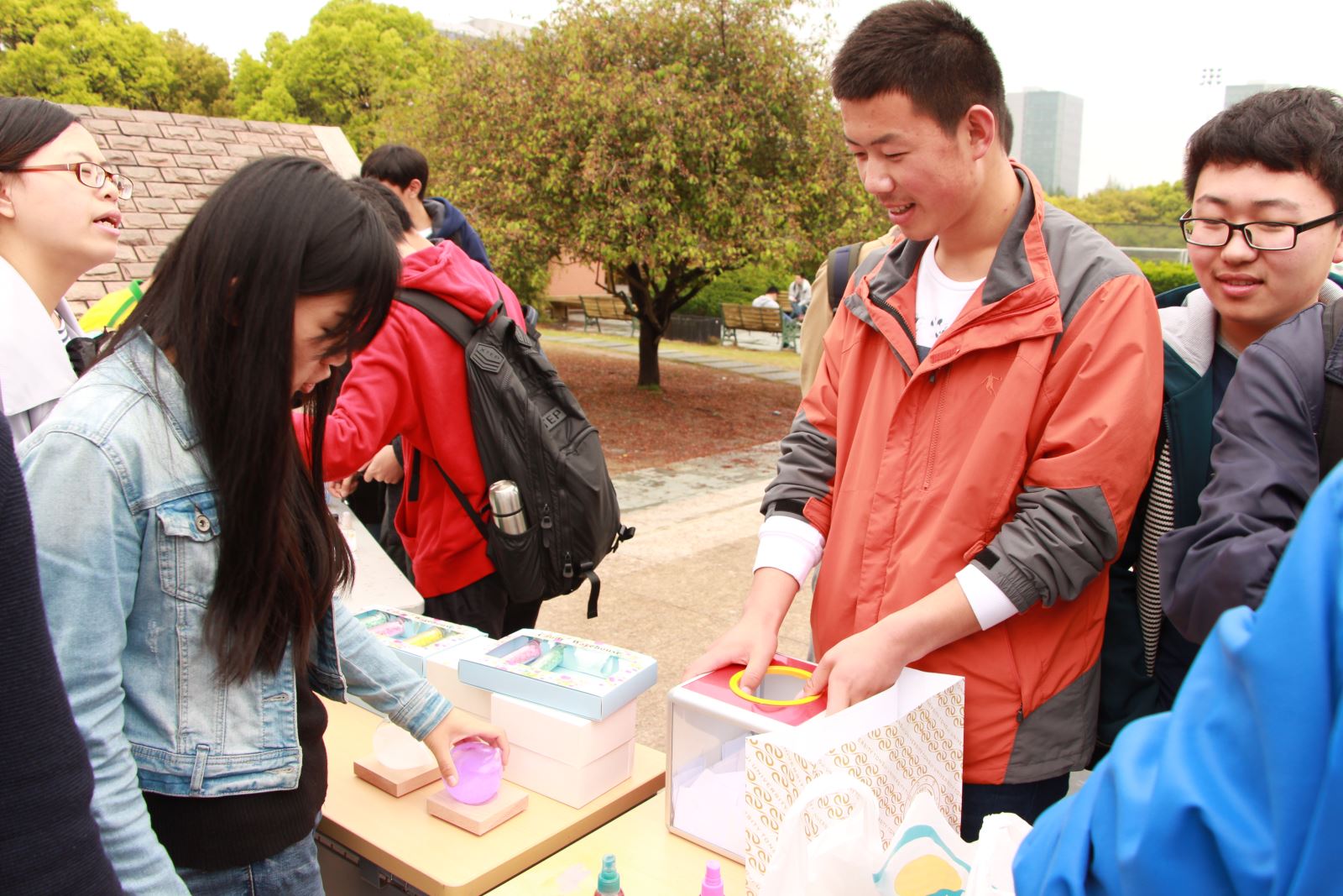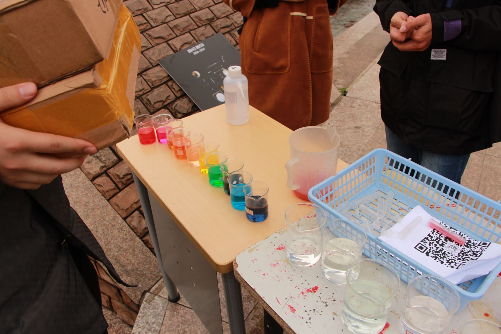 在开幕式现场,员工会成员们准备了精致的礼物、精彩的游戏和精美的义卖品,通过提前的线上线下宣传,开幕式现场聚集了许多来自全校各个院系的同学,大家纷纷对现场表现出了好奇。现场共有义卖、明信片赠送、搭球棍模型、有奖问答、参与实验等五个摊位组成,同学们在成功答题或搭球棍模型后方可获得“晶体明信片”“风暴瓶”“试管糖”等颇具化学风范的奖品。