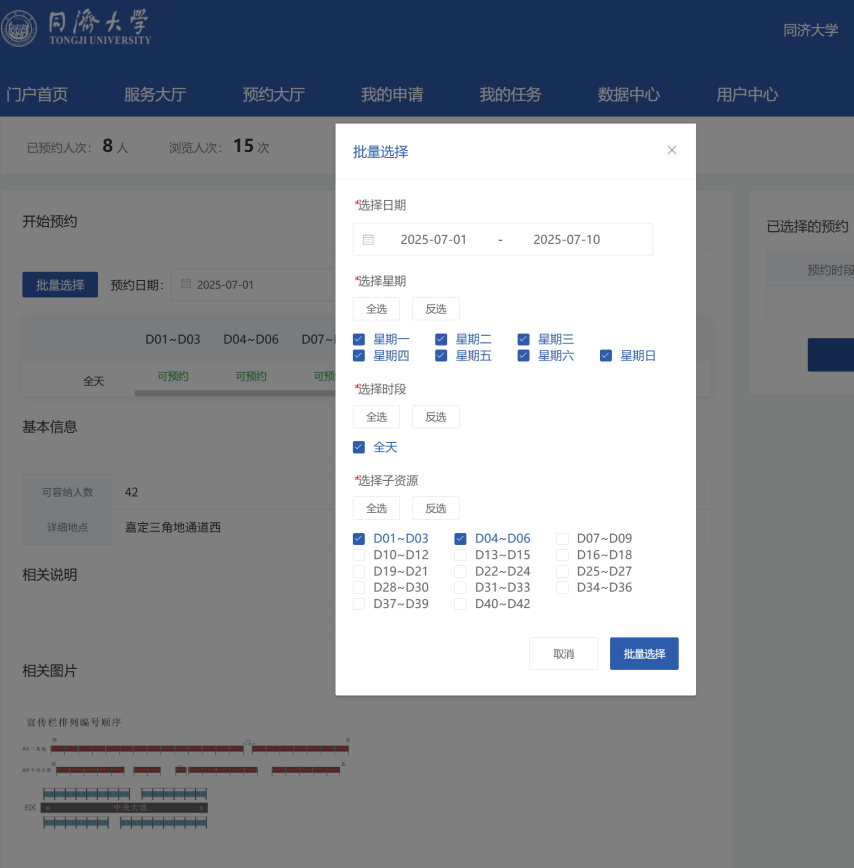 每块展位大小为A0尺寸,以预约7月1日至10日的D01-D06,6块展位为例,可在批量选择中选定块数及使用时间,确认后预约后进入表单填写,预约时间及摊位会自动同步到表单中,按要求填写其他内容并确认无误后可提交审批。具体预约审核结果以流转至宣传部审批后为准。由于展位数量有限,建议合理化安排申请,如不使用请及时取消申请释放资源。