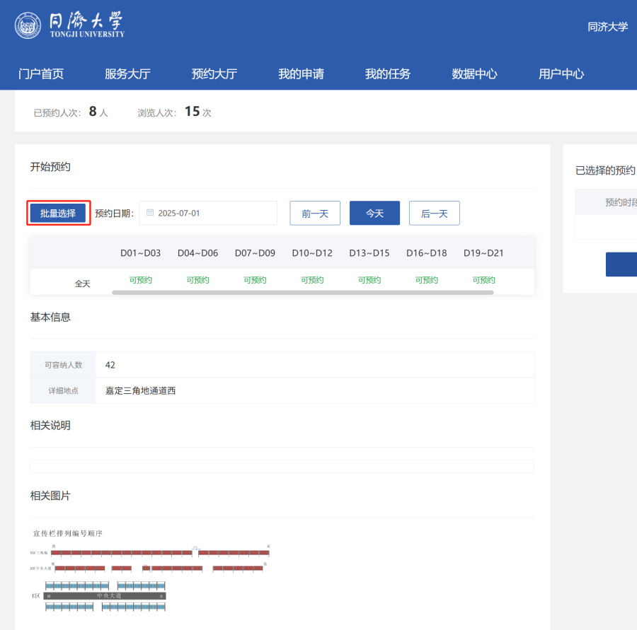 以嘉定校区D区为例,根据编号示意图,选择想要申请的展板位置,点击开始预约进行申请。