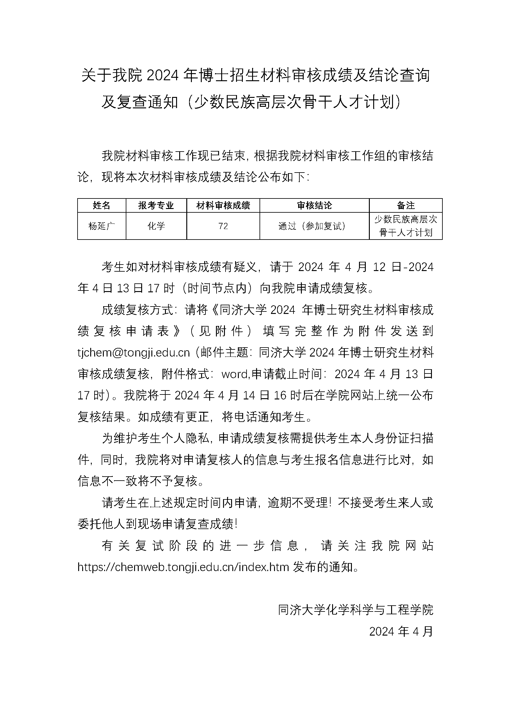 关于公司2024年博士招生材料审核成绩及结论查询及复查通知(少数民族高层次骨干人才计划)