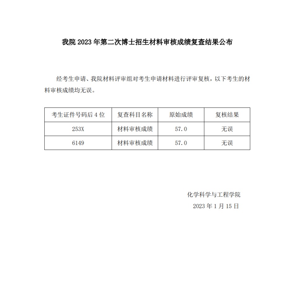公司2023年第二次博士招生材料审核成绩复查结果公布